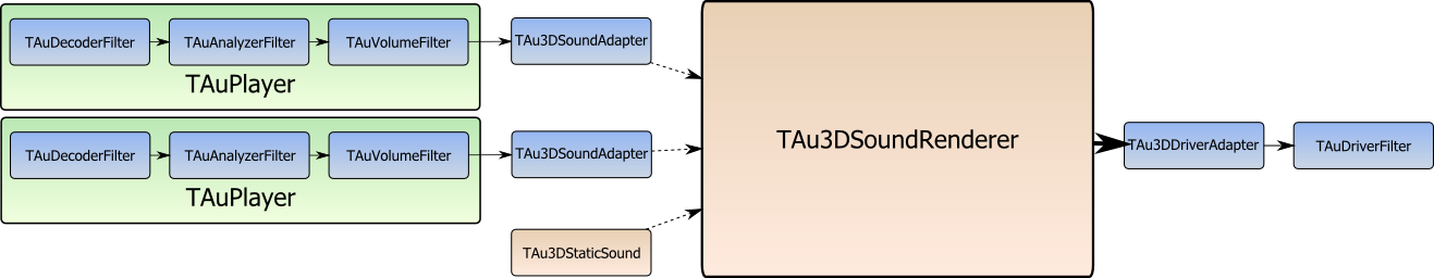 ich habe heute mein Filtergraphsystem und meinen 3D-Audiorenderer "verschmolzen". Gelöst habe ich das Problem eine Klasse namens "TAu3DSoundAdapter": Diese Klasse kann in einen bestehenden Filtergraphen eingebunden werden und verbindet sich wiederrum mit dem 3D-Audiorenderer. Somit kann nun die ganz normale "TAuPlayer"-Klasse verwendet werden um die Audiodaten im 3D-Raum zu rendern: