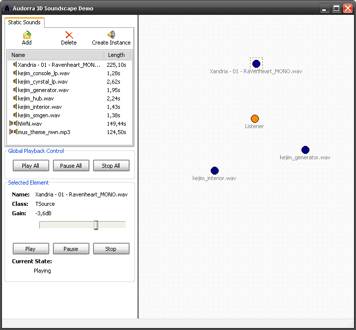Ich habe nun erfolgreich die Klassen "TAuStaticSound" und "TAuSoundList" in meinen 3D-Audiorenderer migriert. Die Klasse "TAuStaticSound" kümmert sich hierbei um das Laden und Speichern von Soundeffekten und stellt ein TAu3DSound Objekt bereit. Soll der Sound wiedergegeben werden, so muss einfach ein Emitter erstellt werden, der mit diesem Soundobjekt verknüpft ist. Der Emitter kann wie gewünscht im Raum verteilt werden.