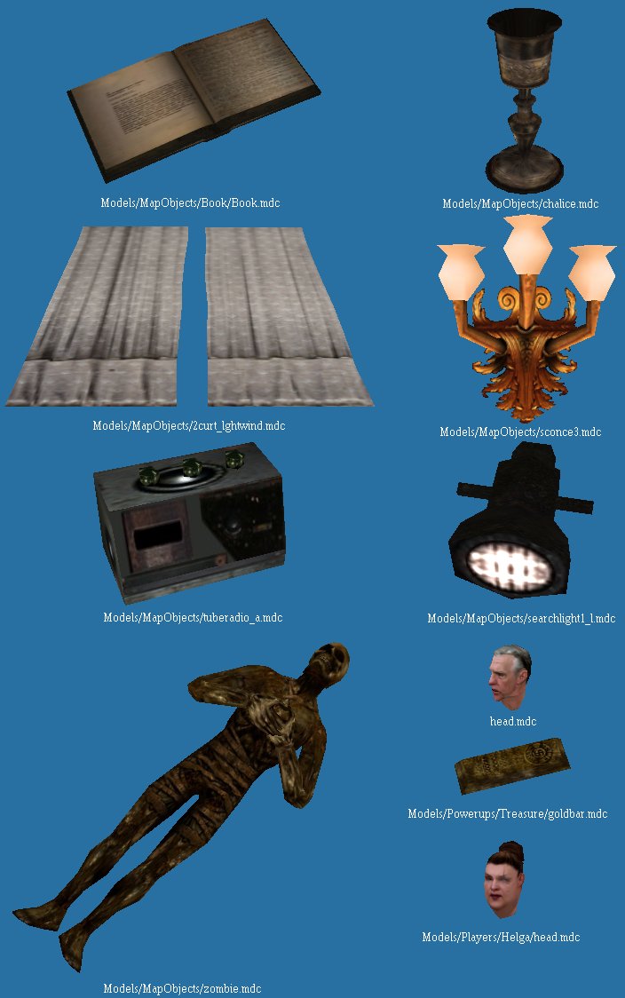 Extract rtcw's pk3 files to the directory called RTCW in the folder u place the exe. Or extract any model files u find on the net to there. Program uses <PROGRAM LOCATION>\RTCW\ as the base dir for loading textures and shaders.