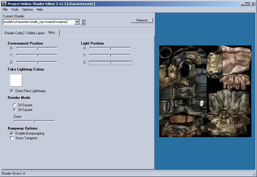 As said above the bumpmapping doesn't work, the output is always a black square. The tangents don't seem to be right... Included is a doom3 shader (modifyed) which if bumpmapping was working would show bumpmapping, there is also a nonbumpmap verson showing what the diffuse texture looks like. (Load -> Mod: Doom 3, Shader: Charactors)