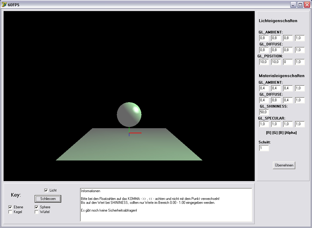 In dem Programm findet man die Einstellungen für Licht und Materialien (aber ich glaube da gibt es noch einige mehr). Desweiteren kann man sich das Licht bei 4 verschiedenen Objekten(Kugel, Ebene, Kegel und Würfel) anschauen.
